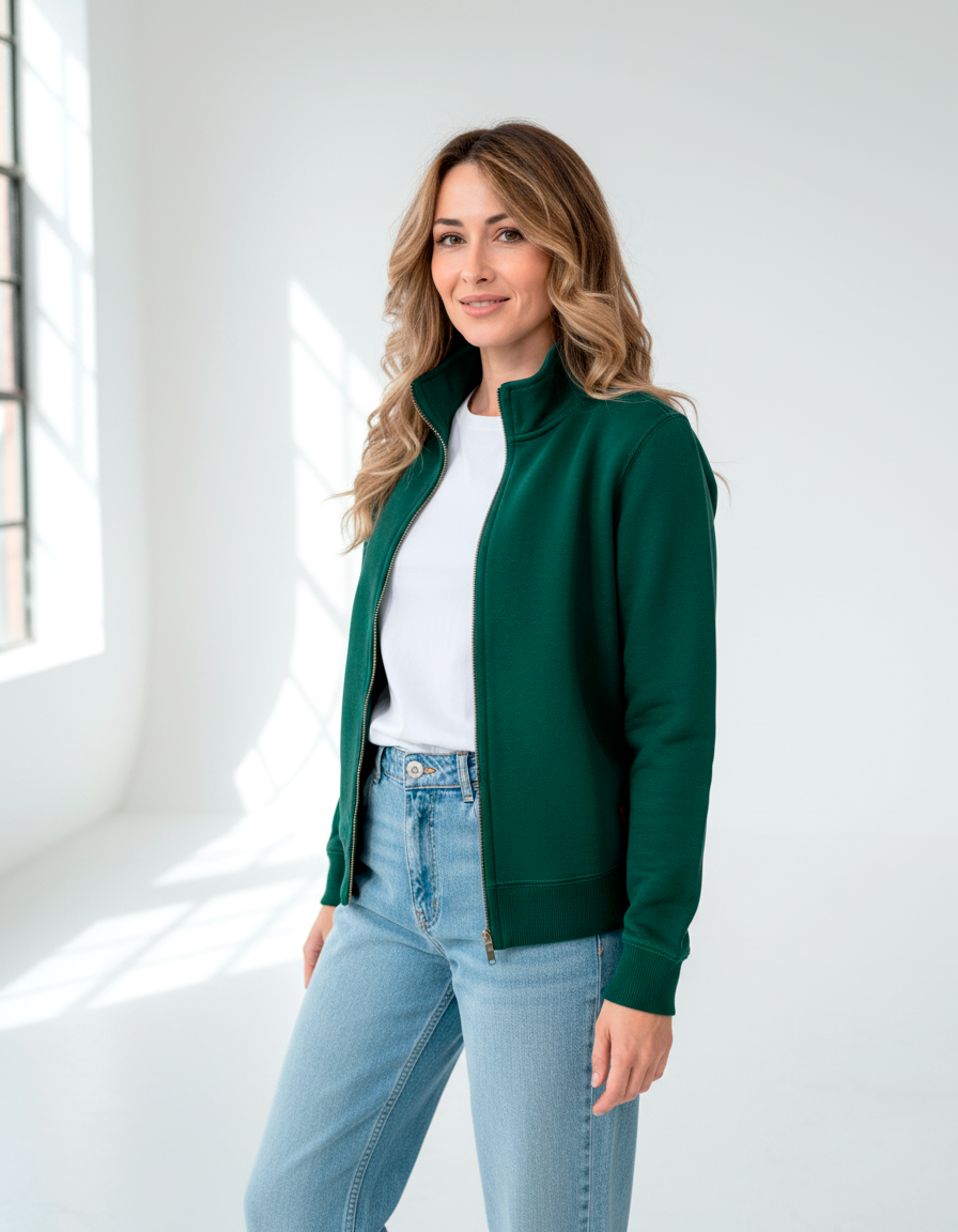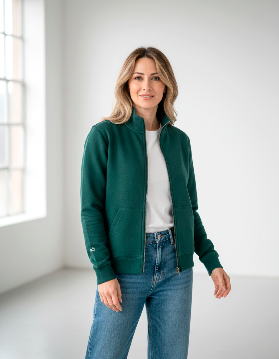 Buzo abierto con cremallera y cuello alto, elaborado en suave Algodón perchado para acompañarte en los días fríos. Tiene un bolsillo tipo canguro al frente, práctico y cómodo. Úsalo con leggings o jogger para ir al gym, o con jeans para un look casual y relajado durante el día.