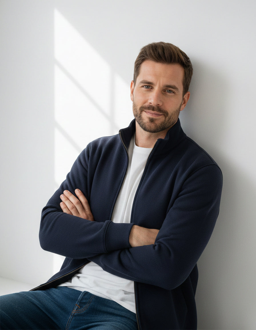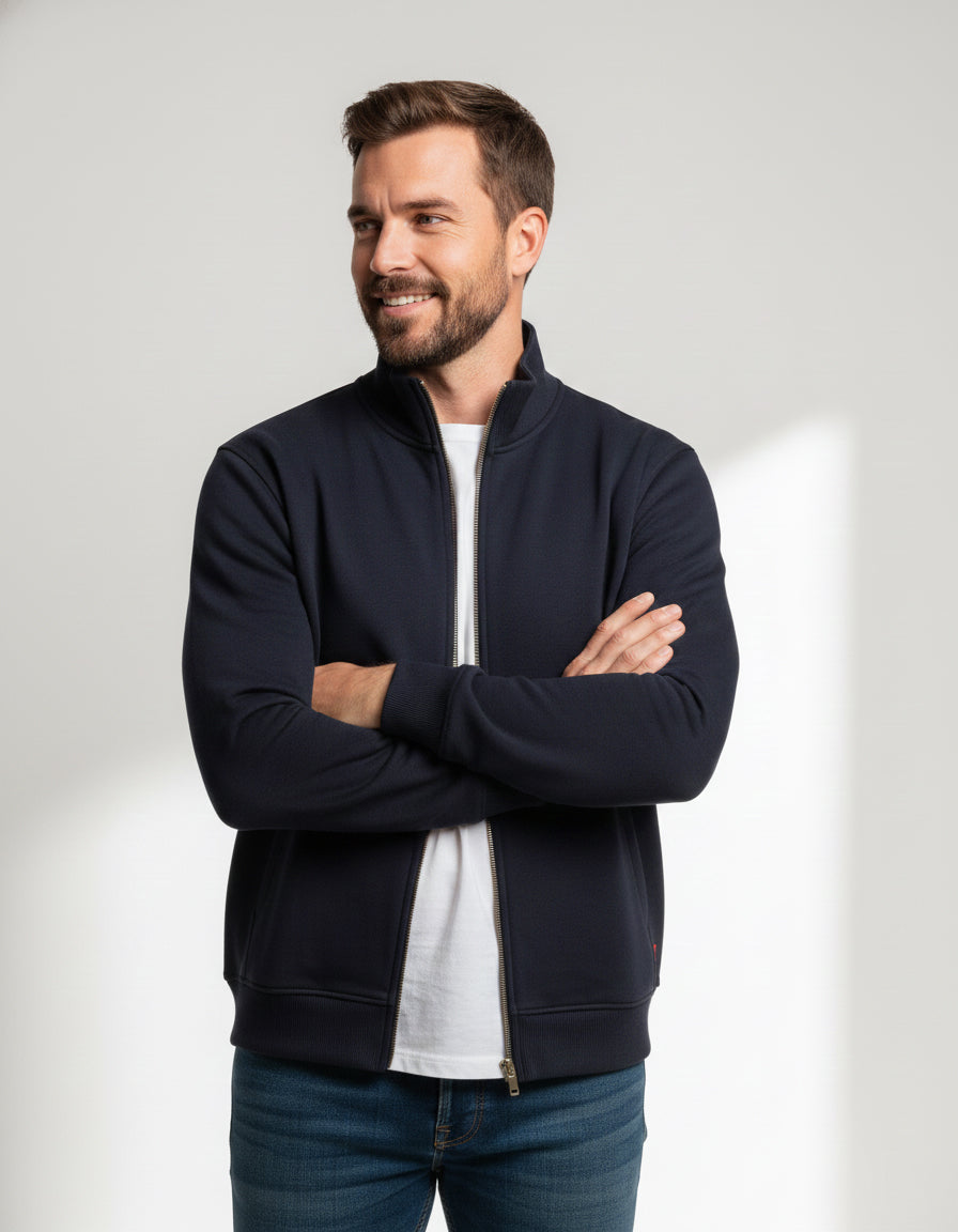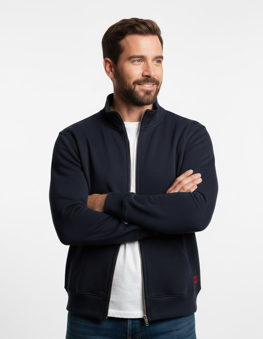 Buzo abierto con cremallera y cuello alto, elaborado en suave fleece perchado para acompañarte en los días fríos. Tiene un bolsillo tipo canguro al frente, práctico y cómodo.