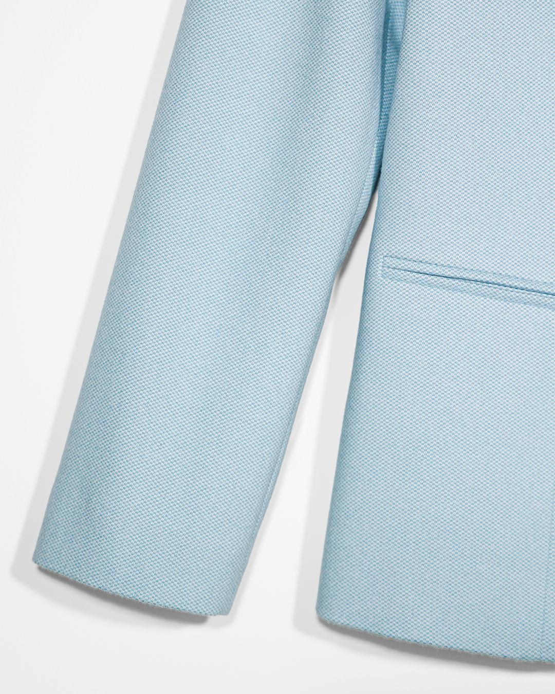 Nuestro blazer Inglés, está hecho en fino tejido plano de twill, de tramado blanco con azul que le da una apariencia de tono pastel, que evoca la sastrería tradicional inglesa, combinada un fit de blazer moderno. Tiene bolsillos externos, hombreras para darle estructura, largo medio y botón en el frente.